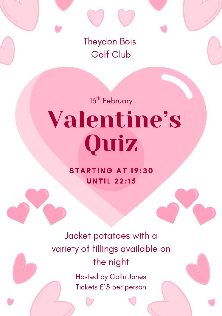 Valentines club quiz night Open to members & guests Fun night with food included See poster for full details Contact Katie for tickets - barmanager@theydongolf.co.uk ...